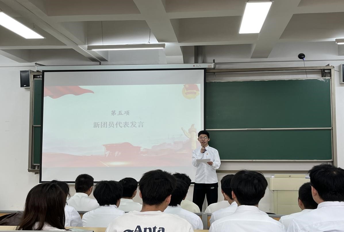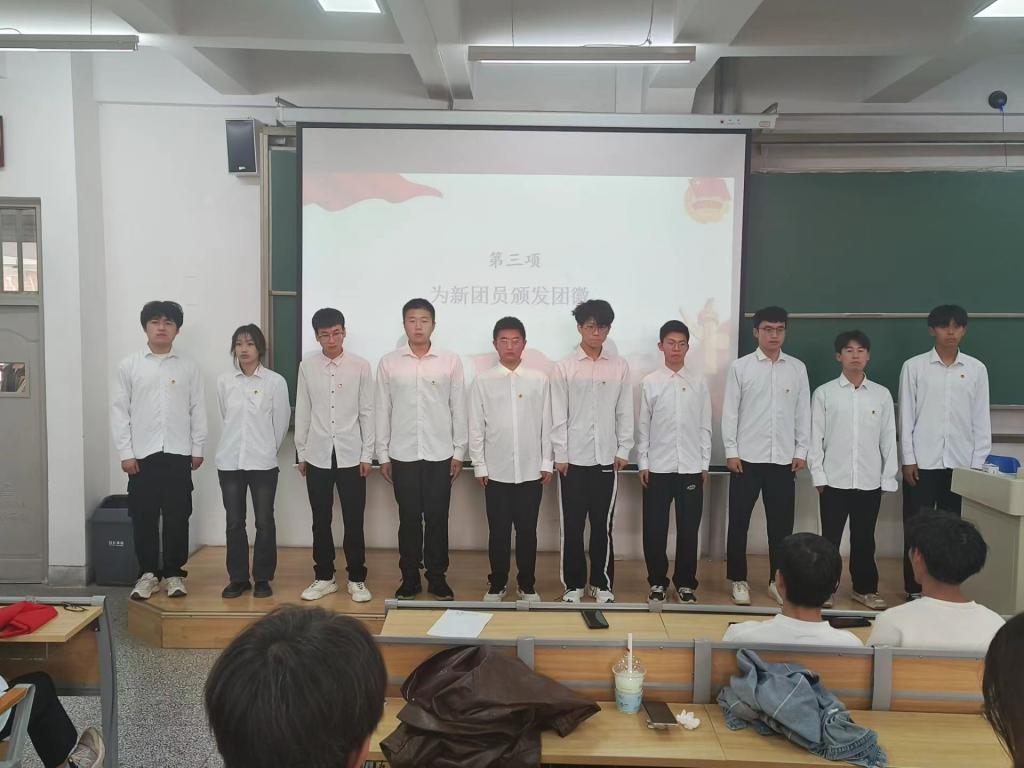 最后,新团员代表发言。新团员代表宫春云同学号召广大团员要积极参加社会实践、主动服务同学、以身作则,用实际行动践行“共青团员”的使命担当。