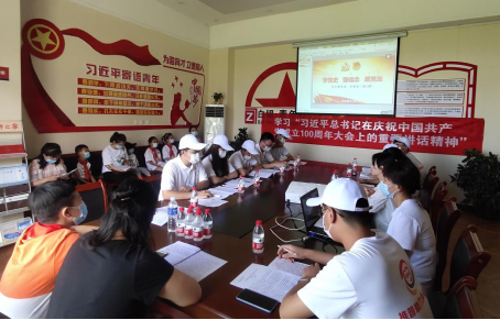 图为实践团队在青年之家学习习近平总书记在庆祝中国共产党成立100周年大会上的重要讲话精神