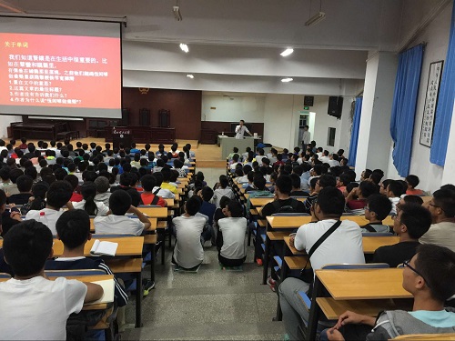 9月9日晚上7点,js33333金沙线路检测邀请新东方讲师张铁钟在西校区1号教学楼举行2016级新生入学系列教育讲座——轻松备考英语四级考试。js33333金沙线路检测2016级561名新生、辅导员、副班主任及助理参加了讲座,反响十分热烈,讲座由魏虹副书记主持。