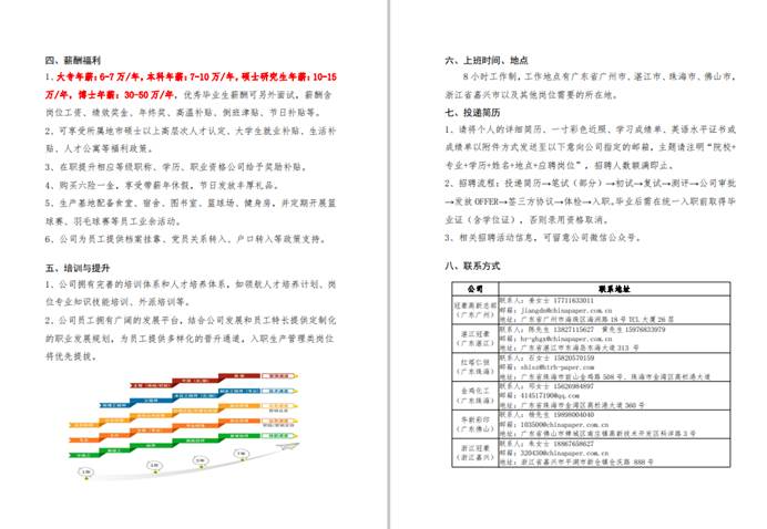 1、薪资发展:公司提供有竞争力的薪资,专项培训、海外深造、轮岗换岗机会,专业技术通道、管理通道双通道职业发展空间,劳模、工匠、精益奖、金牌奖等多级荣誉;