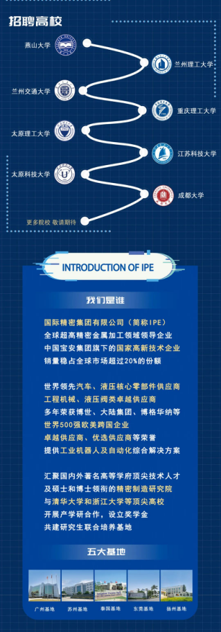 IPE集团成立30年来,聚焦研发、生产和销售超高精密金属零部件及其延申业务领域,产品涵盖汽车核心部件、精密液压元件、消费电子产品零部件、医疗器械零部件、工业机器人和数控机床等。累积了五大核心竞争优势,包括世界一流的自动化制造技术和设备、世界一流的加工工艺、世界一流的精密检测设备和测量技术、国际先进水平热处理产线及解决方案、丰富的材料选取经验及独到解决方案,是世界500强客户真正的一站式技术解决方案的智能制造企业。