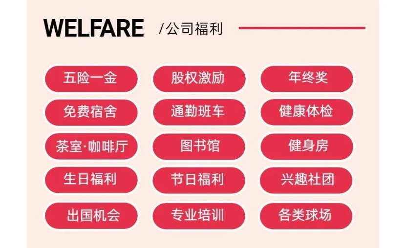 (1)综合月薪:本科:6,200~11,000;硕士:7,600~12,000;(2)其他福利:五险一金、年终奖金、带薪休假、带薪培训、生日会、节假日福利、网红餐厅、免费住宿、免费班车、单身联谊活动、凝聚力活动、社团俱乐部、海外学习机会、定期体检、年会、集体旅游、健身房、娱乐室等;
