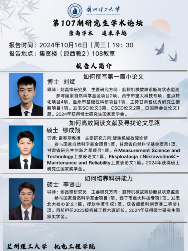 为充分发挥优秀研究生的榜样引领作用,推动学术交流,营造良好学术的氛围,帮助同学们进一步提高科研素养,10月16日,第107期学术论坛研究生学术论坛在彭家坪校区集贤楼(原西教2)108教室顺利举行。本次论坛由js33333金沙线路检测研究生会承办,研究生辅导员马睿,公司2024级全体研究生参加,邀请公司研究生国家奖学金获得者刘斌、缪成翔、李贤山作报告。
