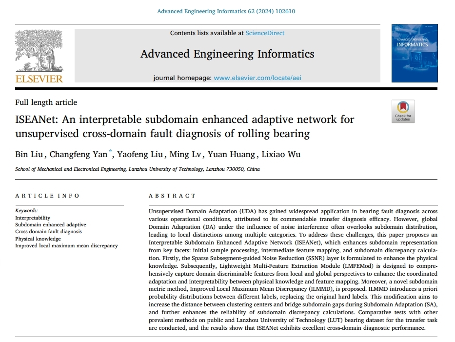 近期,公司智能制造工程系剡昌锋研究员课题组在滚动轴承故障诊断研究方面取得新进展,研究成果以“ISEANet: An interpretable subdomain enhanced adaptive network for unsupervised cross-domain fault diagnosis of rolling bearing(ISEANet: 用于滚动轴承无监督跨域故障诊断的可解释子域增强自适应网络)”为题,于2024年6月4日在线发表于人工智能、工程领域的国际顶级学术期刊《Advanced Engineering Informatics》(IF:8.8)(DOI: 10.1016/j.aei.2024.102610),剡昌锋研究员为通讯作者,博士生刘斌为第一作者。