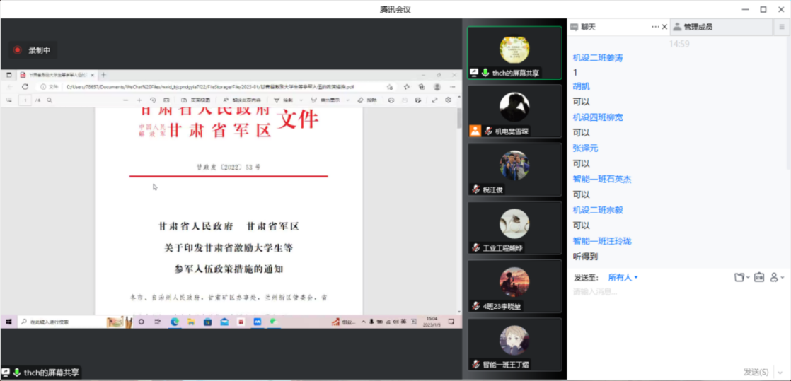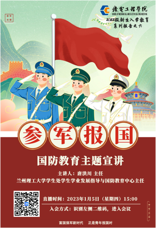 为增强老员工国防意识,宣传老员工参军入伍政策,做好2023年度征兵入伍动员工作,1月5日,公司开展国防教育与征兵主题宣讲活动。本次宣讲由校员工处员工学业发展指导与国防教育中心唐洪川老师主讲,22级全体新生及部分其它年级员工线上参与本次活动。