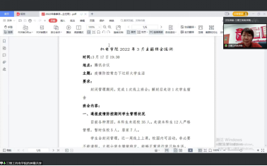 之后,张轶对本月班主任重点工作进行安排,要求各班主任及时召开线上主题班会,一方面,根据年级辅导员整理的班级学情分析结果,引导同学们对上学期的学习进行总结和反思,并根据班级实际,对班级学风建设实施卓有成效的措施。另一方面,加强疫情防控下的人文关怀、安全教育等,辅以日常的电话、线上视频、微信、QQ 方式等关心和了解员工学习、生活中存在的各种问题,积极与辅导员沟通予以解决。鼓励以班级、宿舍为单位,开展小范围多样化的文体活动。