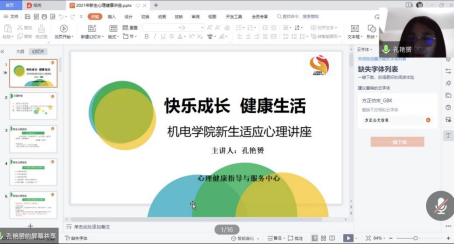 为深入普及心理健康知识,促进员工身心和谐发展,帮助2021级新生尽快适应老员工活,11月30日,js33333金沙线路检测利用腾讯会议举行2021级新生入学教育——心理健康教育专题讲座。本次讲座由js33333金沙线路检测心理健康指导服务中心孔艳赟老师主讲,公司心理专项辅导员吕甜子、21级辅导员刘炜琪及2021级全体同学线上观看了本次讲座。