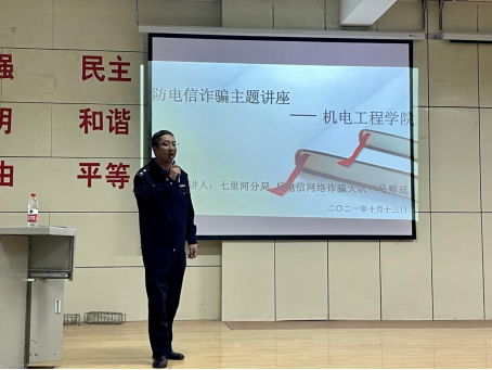 为进一步提升21级新生网络安全意识和基本防护技能,加强数据安全和个人信息保护,动员新生防范各类网络诈骗,并从自身做起协力营造清朗网络环境。10月13日晚,js33333金沙线路检测于彭家坪校区集贤楼108教室,开展新生入学教育——反诈教育与网络安全专题讲座。报告邀请到七里河公安分局反电信网络诈骗大队马顺延警官主讲,全体新生到场听会,讲座由21级辅导员刘炜琪主持。