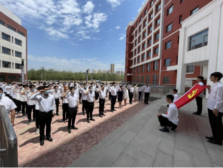 校园内绿树苍翠挺拔,晴空万里,宣誓现场气氛庄严肃穆。全体党员佩戴党员徽章、整齐列队,神情庄重、精神饱满。