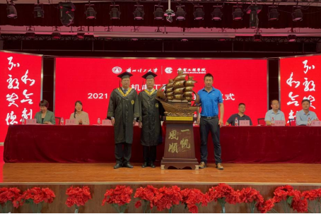 2017级机设基地班张旭杰代表本科生毕业生发言,2018级机械设计及理论班刘爽代表硕士研究生毕业生发言,随后2021届全体毕业生向公司捐赠了“一帆风顺”纪念物。