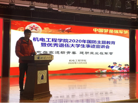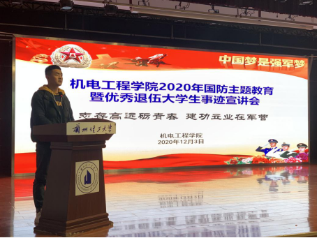 12月3日晚,公司开展国防主题教育暨优秀退伍老员工事迹宣讲会,校学生工作部唐洪川主讲,宣讲会在彭家坪校区老员工活动中心三楼召开,辅导员程万栋、刘炜琪出席。
