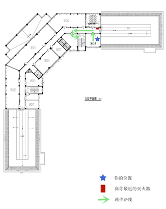 2020年7月7日,机设系安全员党兴武老师,针对部分师生不熟悉逃生路线,不清楚灭火器位置等问题,为机设系所有办公室和研究生用房绘制了逃生路线图,图中用蓝色五角星表示该房间所处位置,红色矩形表示离该房间最近的灭火器位置,绿色箭头表示最近的逃生路线。这种路线图的使用,为提高师生安全意识,增强逃生能力,起到了相应的作用。
