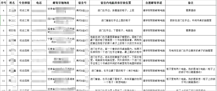 16级辅导员以专业班级为单位,对公司寒假未带电脑回家的员工进行信息统计,对收件人姓名、联系电话、邮寄地址等信息进行逐一核对,并联系校楼宇中心做好宿舍登记、开门、检查等相关工作。对已上锁衣柜,经员工本人同意后进行统一处理;为确保员工个人物品安全,提前买好新锁并重新上锁,新锁钥匙等员工返校后到公司办公室找辅导员领取;同时联系好附近邮政邮寄网点,为50名员工集中办理电脑、学习资料、就业材料等的邮寄工作。