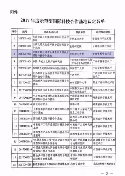 日前,科技部正式公布了2017年示范型国家国际科技合作基地,全国共有38家单位入选,其中包括19所高校。js33333金沙线路检测申报的“丝绸之路经济带金属表面工程技术国际科技合作技术”项目位列其中。甘肃省获批的项目还有敦煌研究院申报的“丝绸之路文化遗产保护国际合作基地”。