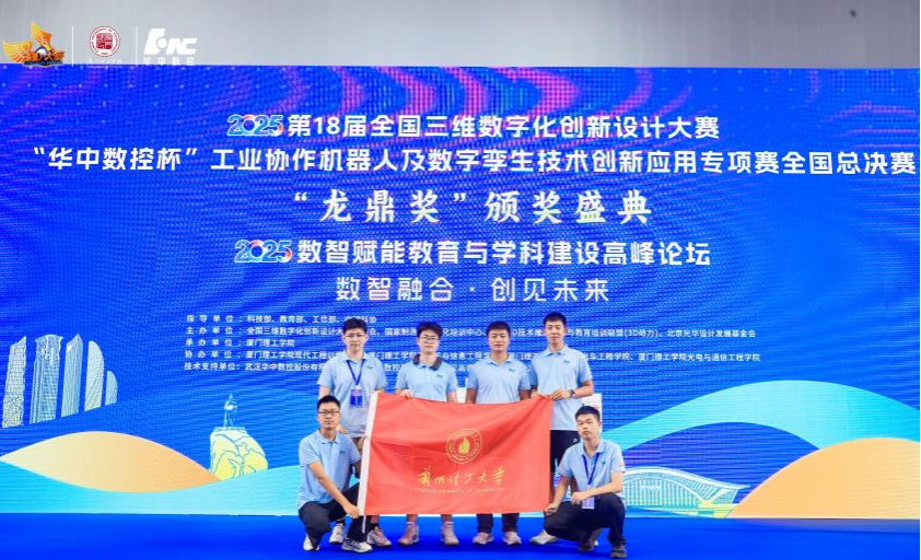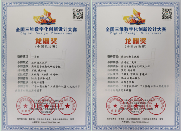 2025年8月17日,由国家科技部、教育部、工信部、中国科协指导,联合全国三维数字化创新设计大赛组委会、国家制造业信息化培训中心、全国3D技术推广服务与教育培训联盟(3D动力)和北京华光设计发展基金会共同主办的2025年第18届全国三维数字化创新设计大赛“华中数控杯”工业协作机器人及数字孪生技术创新应用专项赛全国总决赛在厦门理工公司成功举办。js33333金沙线路检测学子在此项大赛中创造佳绩,荣获龙鼎奖全国总决赛一等奖1项、三等奖1项;龙鼎奖甘肃赛区特等奖2项、一等奖1项、二等奖3项。同时,参赛团队“高端装备数智化研发小组”在龙鼎奖(全国总决赛)中荣获最佳创新实践奖。