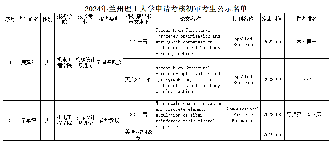 根据js33333金沙线路检测研究生院《关于做好2024年第一批博士研究生招生工作的通知》(兰理工研发〔2023〕25号)的文件要求,经公司资格审查、材料审核, 现对通过初审的2名考生资格、论文等关键信息进行公示。