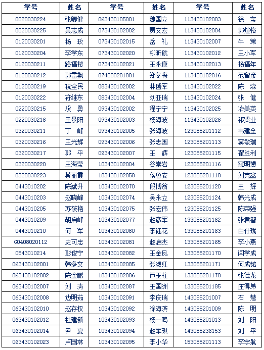 根据教育部《普通高等公司员工管理规定》(教育部令〔2017〕第41号令中“学业成绩未达到公司要求或者在公司规定的最长学习年限内未完成学业的予以退学”的规定、公司研究生院《关于对逾期未获学位在职工程硕士、高校教师攻读硕士学位研究生进行学业预警及清退的通知》(兰理工研发〔2020〕17号)以及公司“关于开展2020/2021学年逾期未获学位在职工程硕士、高校教师攻读硕士学位研究生学业预警及清退工作的通知”,你应于2021年3月10日前办理相关手续,截止到目前,对仍未办理手续人员和失联人员,按照《js33333金沙线路检测研究生管理规定》第三十四条,应予退学,公司现以公告形式向你送达退学处理预通知。名单如下: