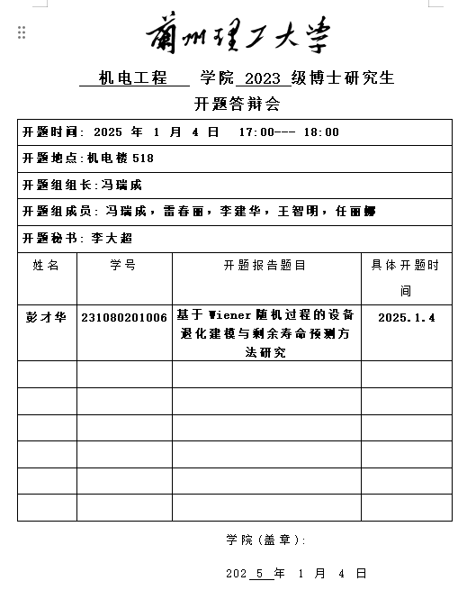 2024年秋季学期博士研究生开题答辩安排(彭才华)