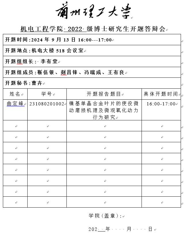 2024年秋季学期博士研究生开题答辩安排(曲定峰)