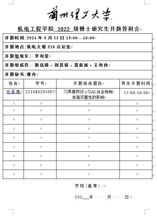 2024年秋季学期博士研究生开题答辩安排(任泽海)