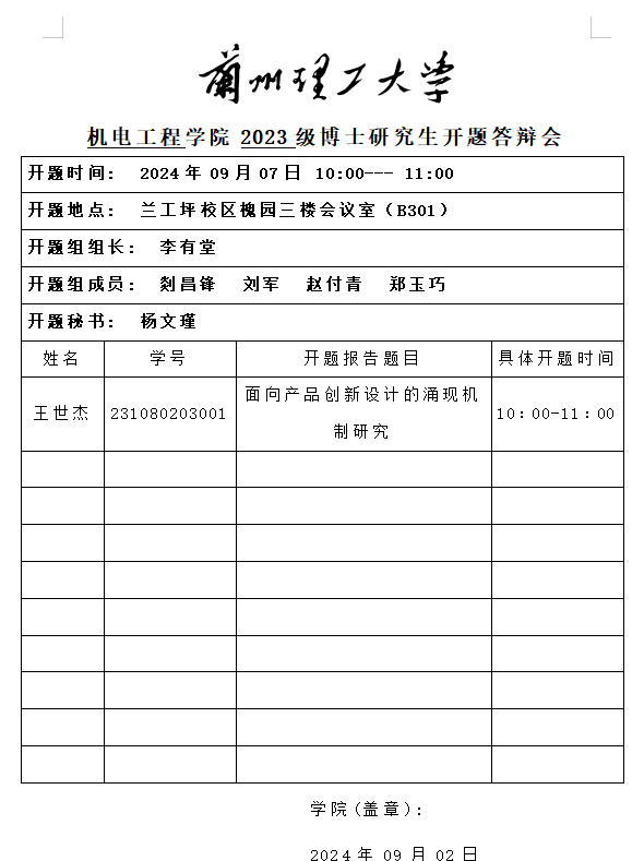 2024年秋季学期博士研究生开题答辩安排(王世杰)