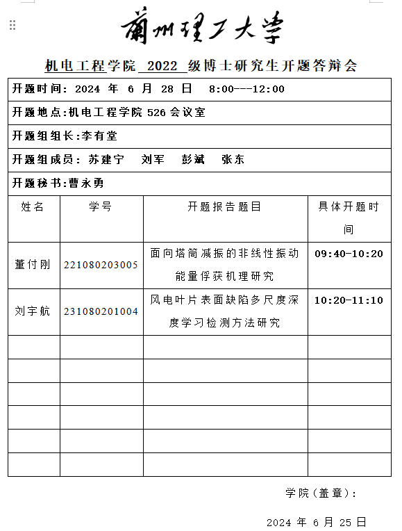2024年春季学期博士研究生开题答辩安排(董付刚 刘宇航)
