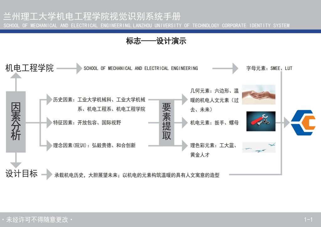 1、标志的正负形设计将扳手、螺母和插头等机电基础元素有机融合,凝练出简洁、稳固、美好的图案。